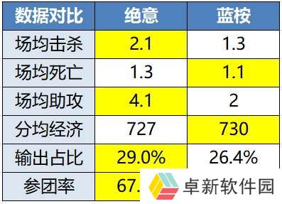 蓝桉这边,自进入射核版本之后发挥就一直很低迷,而在年总的赛制下把把体验大师组的对抗,数据自然是碎得没法看的。只有场均1.1次的死亡排名发育路最低,而场均击杀1.3、助攻2、参团率45.5%,三项数据全都是发育路垫底。
