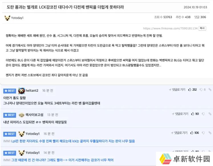 直播吧10月19日讯 2024英雄联盟全球总决赛八强第二场比赛BLG以3比1战胜HLE晋级四强,韩国FMKOREA论坛网友锐评LCK教练,原贴及热门评论如下:
