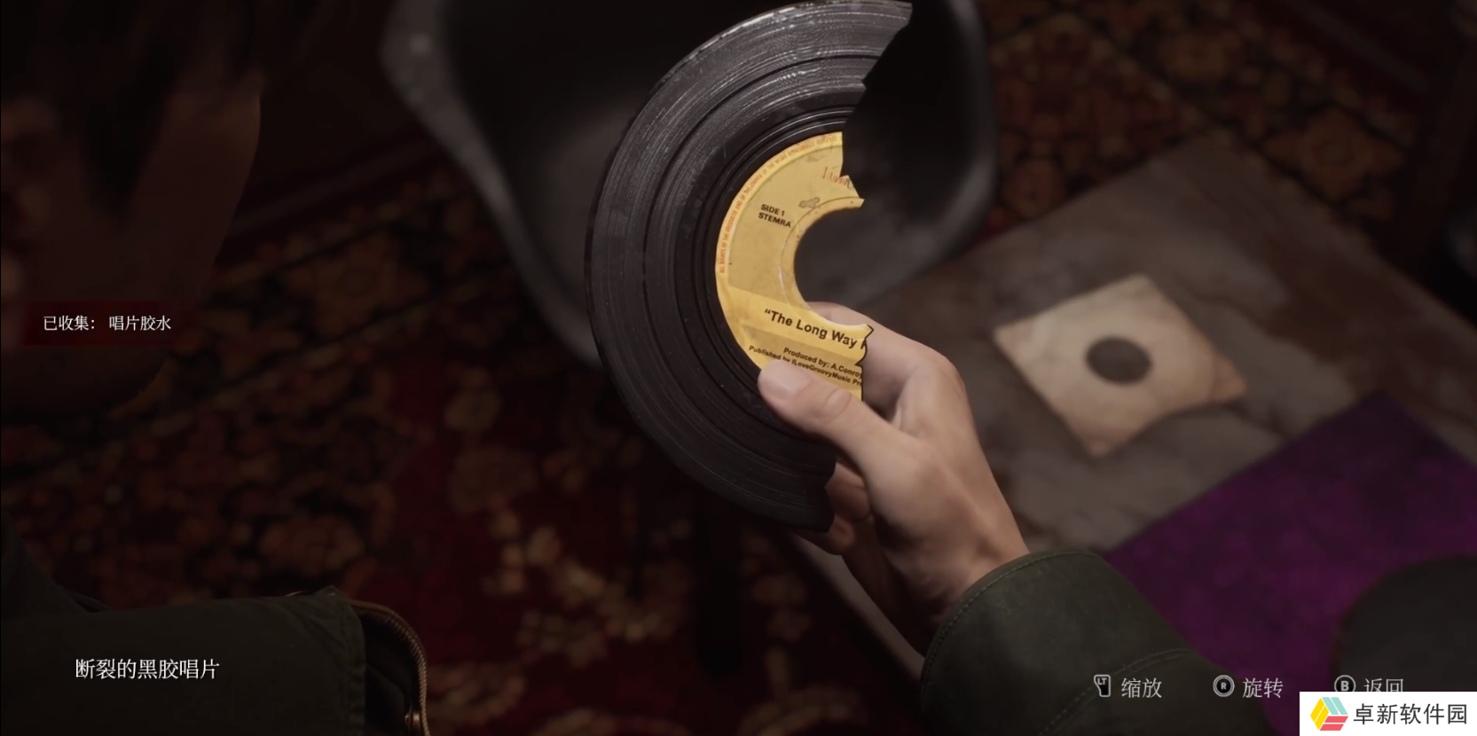 第一张在妙乐唱片店,砸碎玻璃就可以拿到关键物品断裂的黑胶唱片和唱片胶水。
