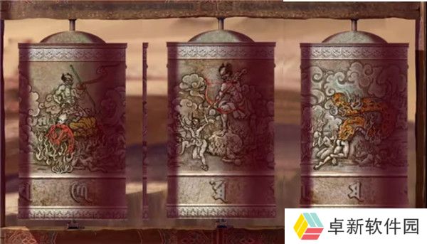 5、点击门再次来到转轮场景,对右上角的门使用梯子后门自动开了,进入沙漠场景看到彤彤和卿卿,不过无法对话,点击左边的佛像,线索就是转轮殿中那几个人的变化了,调整一下如下图佛像裂开了拿到断臂和一个小圆球。