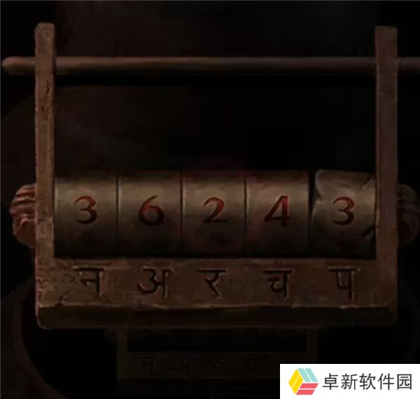 4、对大油锅使用夹子能拿到一块鸳鸯雕塑,然后后退来到转轮场景,查看右边的炉子,注意炉子上的线索和尺子上的鬼画符是不对应的,所以炉子的密码是36243,调整一下打开炉子拿到一块拼图,后退一下到冰冻场景,将拼图放在左上角的拼图上开始调整吧~调整完毕如下图,打开后的空间拿到梯子。