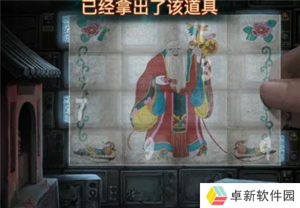 6、查看一下中间位置的无臂佛像,将两只手臂都给装上去后佛像双手合十起飞了,下面露出一个门,不过我们先不着急进门,在右边中间位置,彤彤晕倒的稍微往下一点的裂缝那里还有一张纸,查看一下有线索图,记下来上面中间房子,第二行右边戴帽子人,第三行中间彩虹右下角云彩。