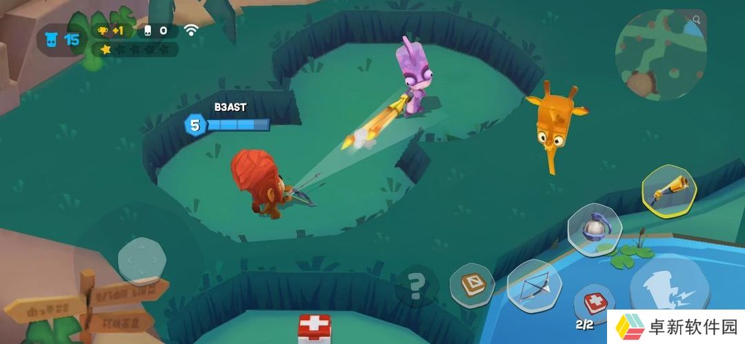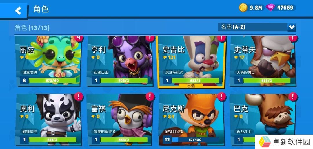 每种动物有不同特性和解锁条件,如1级狐狸擅长放风筝,大猩猩布鲁斯适合前排。