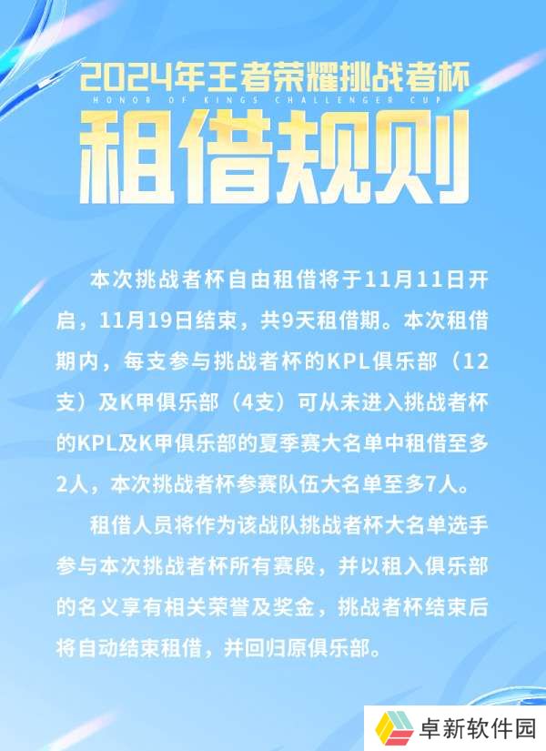 本次挑战者杯自由租借将于11月11日开启,11月19日结束,共9天租借期。本次租借期内,每支参与挑战者杯的KPL俱乐部(12支)及K甲俱乐部(4支)可从未进入挑战者杯的KPL及K甲俱乐部的夏季赛大名单中租借至多2人,本次挑战者杯参赛队伍大名单至多7人。