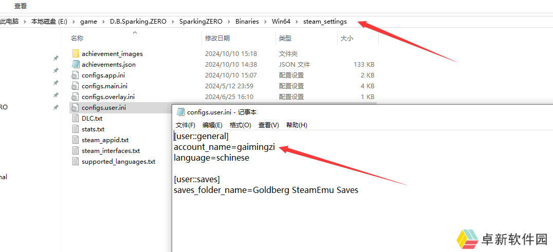 改名字:记事本方式打开SparkingZEROBinariesWin64steam_settingsconfigs.user.ini,把account_name=gaimingzi里面的名字gaimingzi改成自己想要的,保存。
