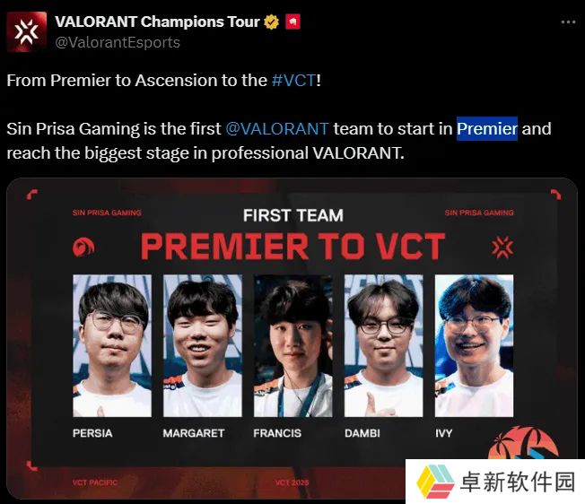 VCT官方推特发文表示:太平洋晋升赛冠军SPG是首支从Premier打到VCT的队伍。原文如下: