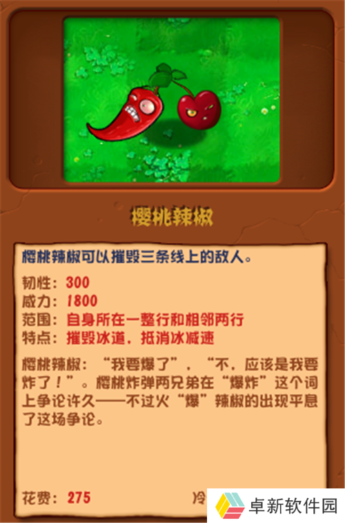 评价:火与辣的完美融合,能同时轰炸三条线。虽威力平平,但清杂效果显著。建议在雪车大爷被消灭后,用于恢复草地的和平。