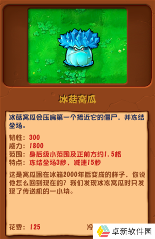 评价:与雪花寒冰菇相媲美的一次性全屏伤害植物,结合仙人掌子弹的穿透效果,清杂能力超群。建议在大批僵尸来袭时使用。