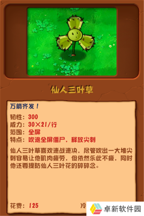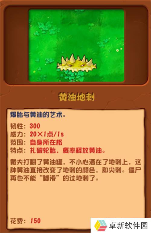 评价:草地上的尴尬存在,只能与轮胎一换一,效果甚至不如100阳光的大蒜花。面对巨人系列僵尸时,其效果更是微乎其微。