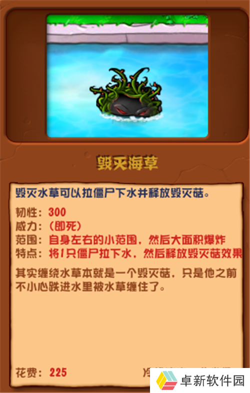评价:水中霸主,唯一的概念神级存在。被其捕获的僵尸都将面临毁灭,并伴随毁灭菇的毁灭效果。推荐在面对伽刚特尔等多种形态僵尸时使用。