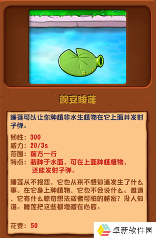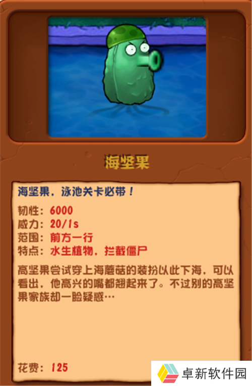 评价:前期水上防御的得力助手,仅需125阳光即可拥有不俗的防御与攻击力。最吸引人的是,无需额外种植睡莲!