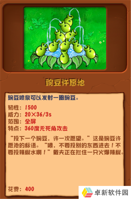 评价:400阳光的高昂代价,却仅发射普通豌豆。宛如将豌豆捧在掌心,它却将你推向僵尸的怀抱。建议搭配附魔型植物,以增强其实战效果。