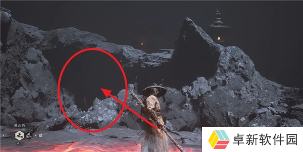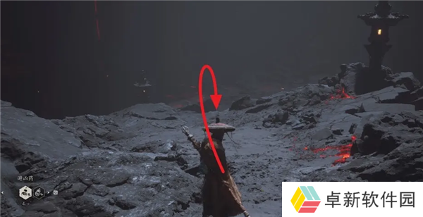 沿着山路一直往前走到斜坡快到底部的位置,可以看到前方两个是灯笼,从石灯笼处往下跳,可以看到岩壁上有个山洞。这里也可以直接走到底然后走进山洞,因为附近环境比较像,所以用石灯笼来做标志物方便大家区分。