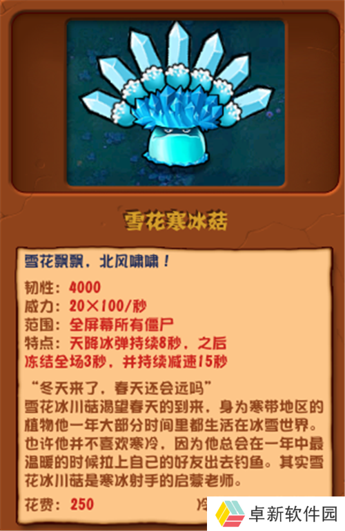 评价:8秒后冻结全场3秒,**僵尸来袭时的绝佳辅助。为其他植物创造更多输出时间。