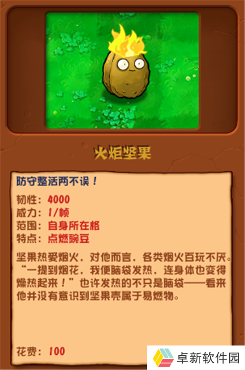 评价:零成本,阳光爆炸。每次CD刷新后建议放置,但伤害有限,对钢盔橄榄球僵尸稍显无力。
