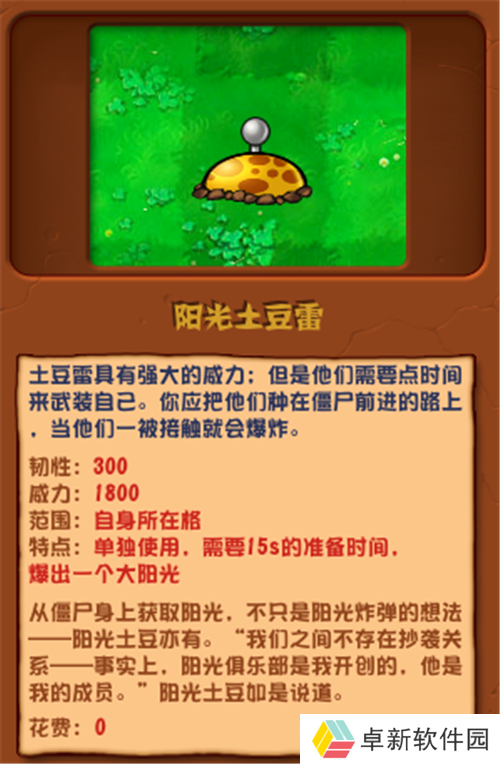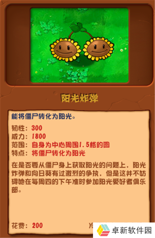 评价:樱桃炸弹与向日葵的完美结合,适合在僵尸潮时清场并获大量阳光。非紧急情况,阳光土豆更为优选。