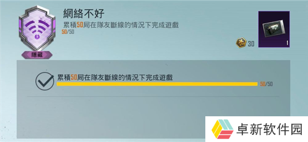 完成50局队友断线时的游戏。只需队友断线标志出现,可尝试开局后60秒退出。双排可搭配“自食其果”成就,四排则在“利维科”让一队友退出,其余三人不进圈。