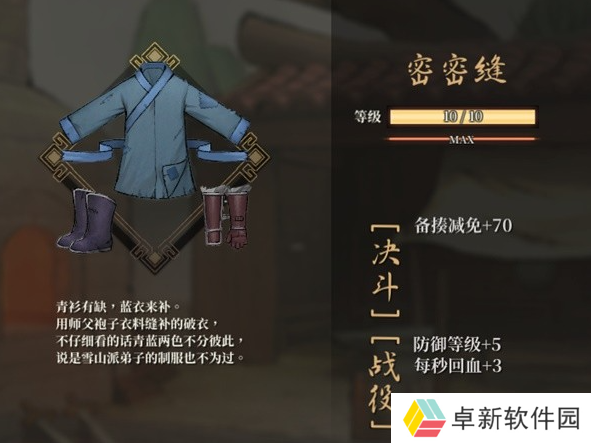 3、之后在烤火时,师傅脱下主角衣服并缝上雪山派的蓝色衣料,就可以解锁【密密缝】了。