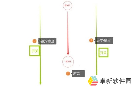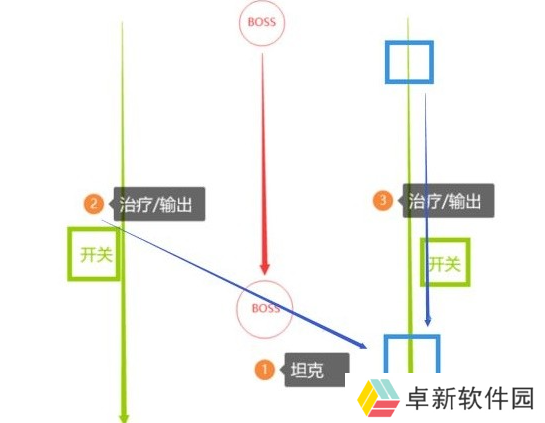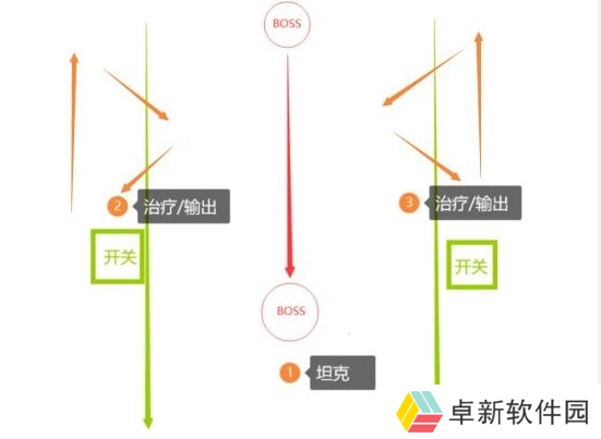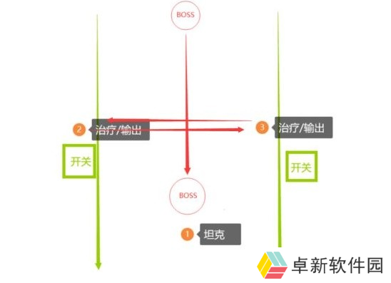 队伍中的DPS治疗分成两队站在开关附近,尽量左右分开站位,如果队伍中有近战DPS则站在BOSS和开开关中间。