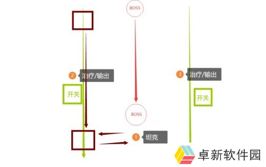 此BOSS整场战斗中需要一直保持如下站位,下文大量技能的处理方式会根据此站位进行讲解。