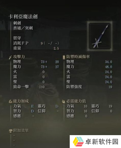 3、这个武器可以放所有的魔法!但数值不是很好, 实测后+25的加成只有C,最基本的辉石魔砾用卡利亚魔法剑打小怪 = 3XX; 智力S法杖 = 6xx - 7xx,智力高的话用来刺刺小怪算是不错玩 (但对比其他新武器, 这暂时算是失色吧)。
