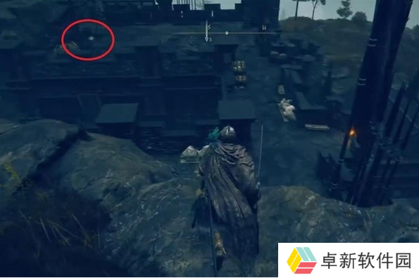 2、然后在悬崖可以看到要塞的顶部, 红圈位置就是宝箱目标,如下图:
