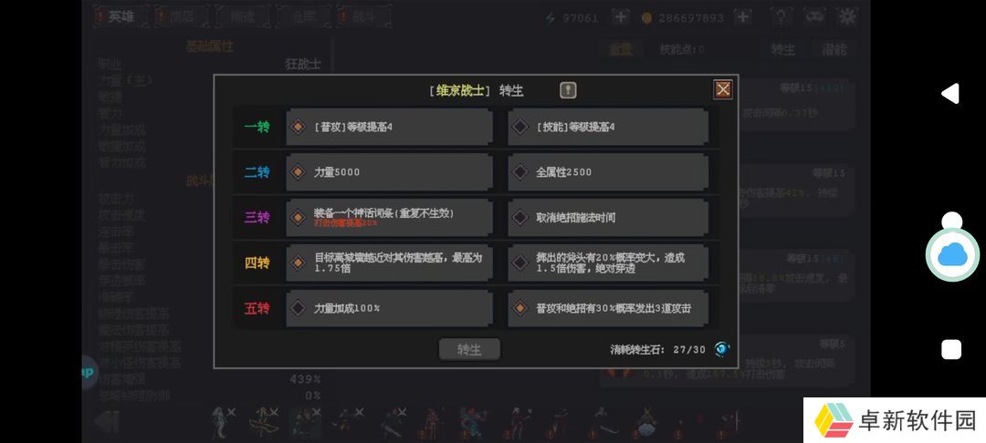 每个英雄达到60级后开放转生,需要消耗转生石,按转生次数分别消耗5,10,15,20,25个,英雄将回到1级,获取额外的基础属性和转生词条。转生词条2条线可以随意选择与更换,所以无需反复询问转生选择那条,不同时期选择不一样,自己打桩试试就行。注:无尽无经验。