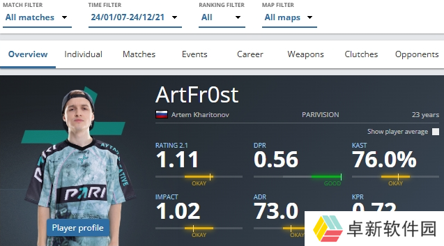 加入PARIVISION至今,他的数据有所下滑,拿到1.11 rating。