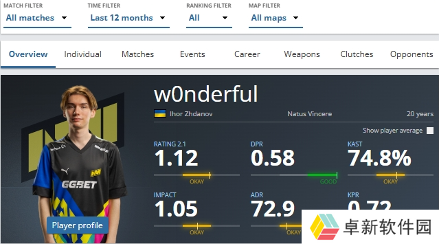 个人数据方面,w0nderful在过去一年中打出1.12 rating的表现。