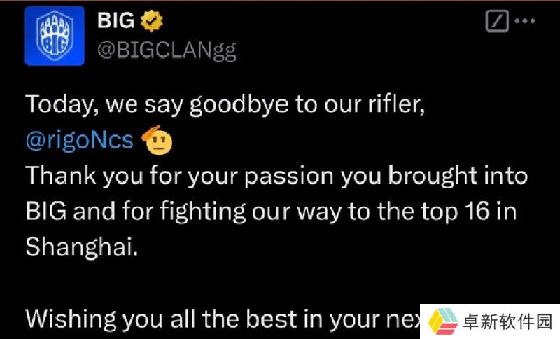 “今天,我们与我们的步枪手rigoN告别,感谢你为BIG带来的激情以及为我们在上海Major闯入前16名的努力,祝您在生涯旅途的下一篇章中一切顺利!”