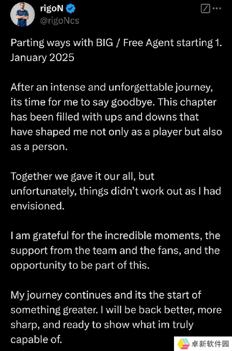 “与BIG告别,从2025年1月1日起成为自由身。经过一段充满激动与难忘时光的旅程,现在是时候说再见了。这一章充满了起伏,塑造了我不仅作为一名选手,也作为一个人的成长。我们一起全力以赴,但遗憾的是,事情并未如我所期待的那样发展。我感激那些难忘的时刻,感谢团队和粉丝们的支持,也感谢有机会成为这一部分。我的旅程仍在继续,这也是更伟大征程的开始。我会以更加锐利的状态归来,准备好展示我真正的实力。”